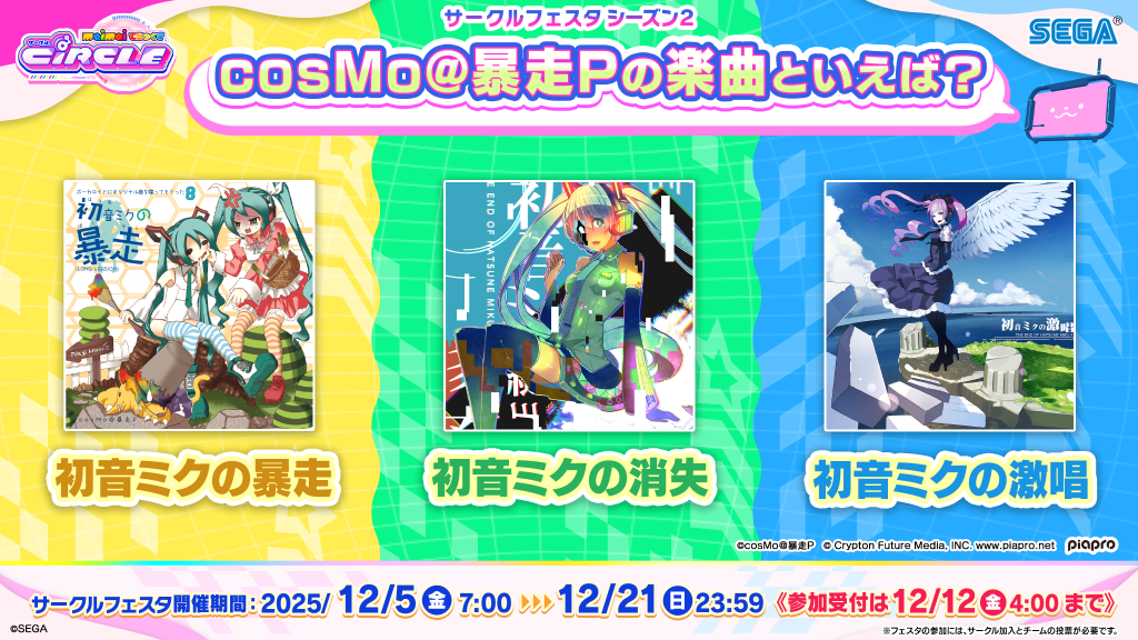 | 12月12日(金) 4:00 | 「サークルフェスタ シーズン2」参加締め切り(投票期間終了) ※投票期間終了までにサークル内で1票も投票が行われなかった場合は、 サークルフェスタには参加できなくなりますので、ご注意ください。 |